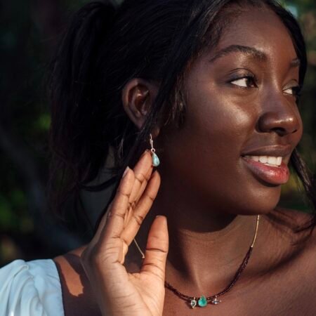 Reversible earrings made of Larimar stone, amber and 925 silver. 0.78 ” long (including bail) x 0.43 ” wide x 0.34 ” thick