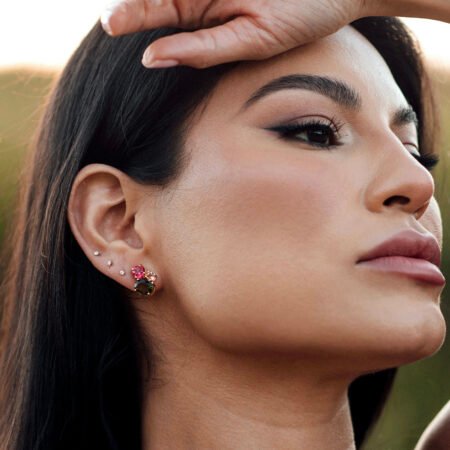 Handmade gold plated earrings. Made of dark green, dark pink and champagne round crystals. Designed by brazilian artisans